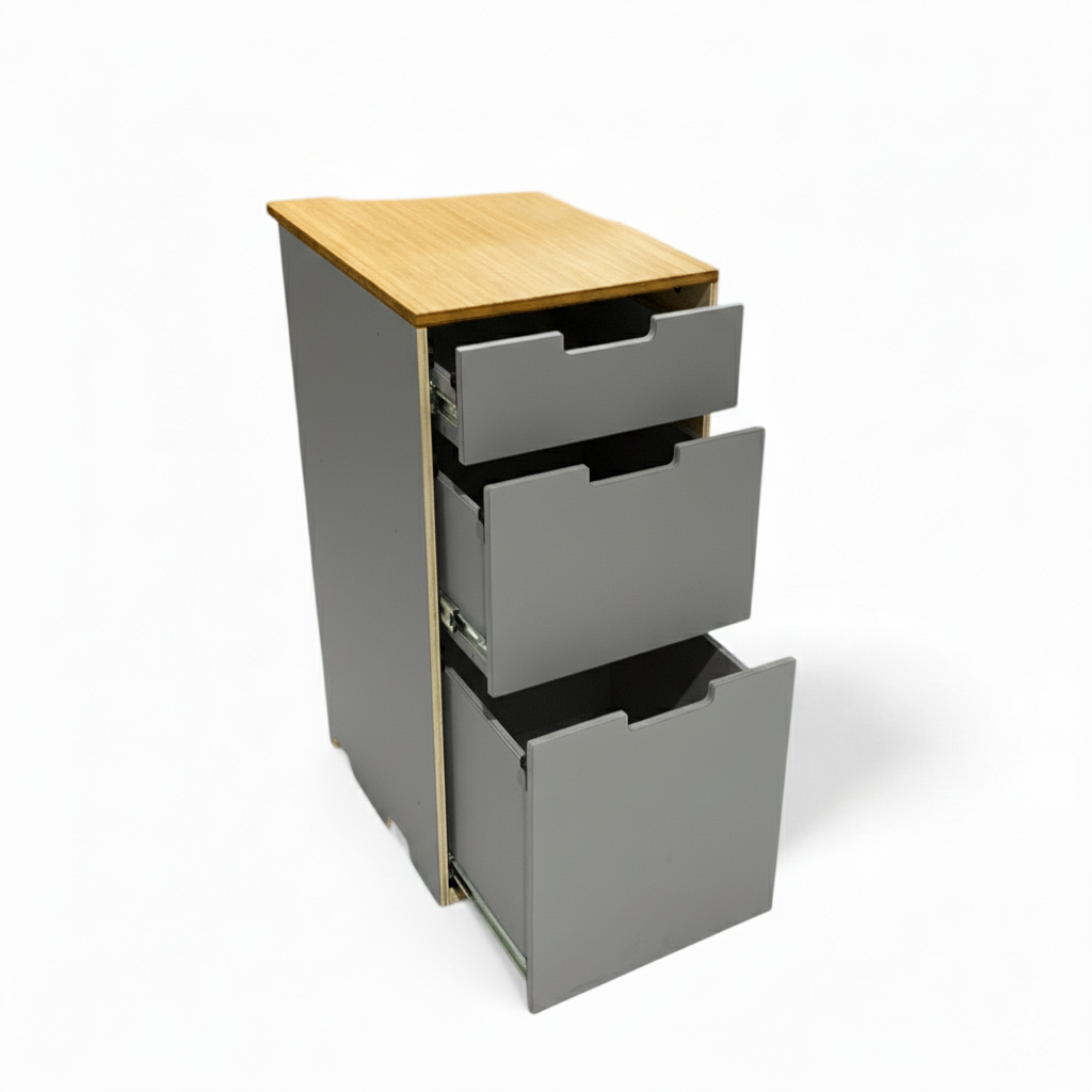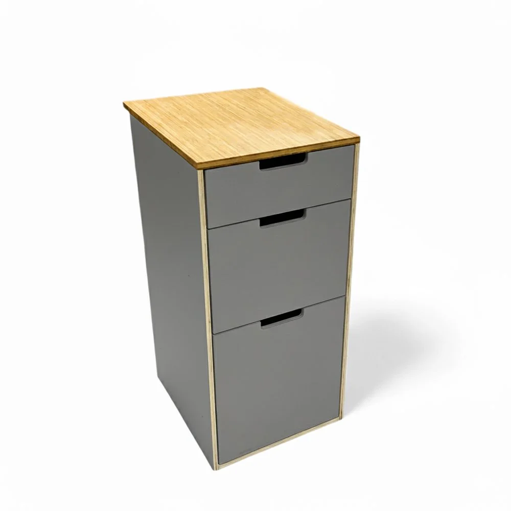 Korpus und Blende aus Leichtholz Multiplex 13 mm mit modernen, robusten HPL-Oberflächen in 2 Standardfarben (Sand oder Aschgrau)