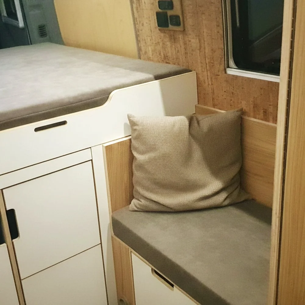 Sitzen und Verstauen im Fahrzeug – plus mobiler Sitzhocker durch herausnehmbaren Schubkasten. Ultraleicht, robust und gemacht für flexible Camper-Layouts.